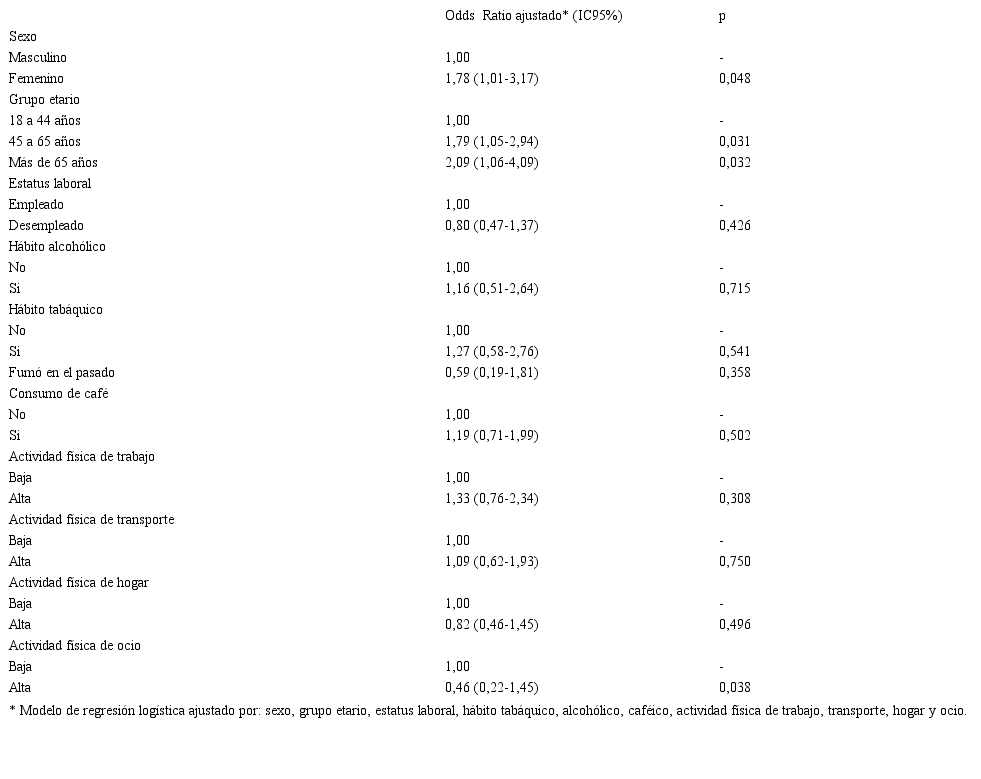 Al evaluarse las variables asociadas a la obesidad mediante análisis multivariante; se evidenció que los factores que mostraron mayor influencia para la obesidad fueron el sexo femenino (OR=1,78; IC95%: 1,01-3,17; .=0,048); edad de 45 a 65 años (OR=1,79; IC95%: 1,05-2,94; .=0,031), edad mayor a 65 años (OR=2,09; IC95%: 1,06-4,09; .=0,032); y la actividad física de ocio de comportó como un factor de protección para obesidad (OR=0,46; IC95%: 0,22-1,45; .=0,038), el resto de dominios de actividad física no tuvo un efecto significativo sobre la obesidad, Tabla 2.