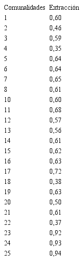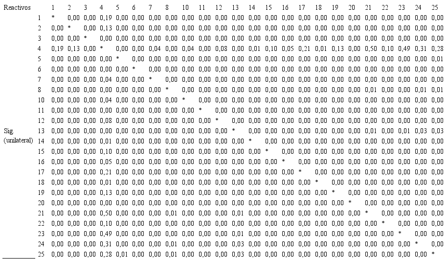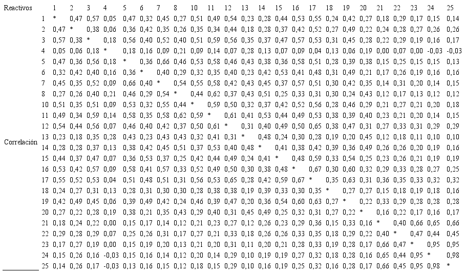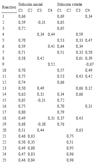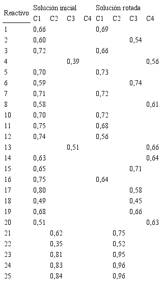Después, se procedió a identificar cuales reactivos conforman cada componente, y se encontró que el componente 1, se conforma por los reactivos 1, 3, 5, 6, 10, 11, 12 y 16, el componente 2, por los reactivos 21, 22, 23, 24 y 25, el componente 3, por los reactivos 2, 6, 15, 17, 18 y 19, y el componente 4, por los reactivos 4, 8, 13, 14 y 20 (ver tabla 6).