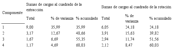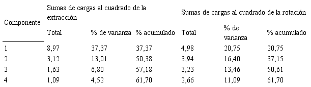 Seguido a esto, se realizó el gráfico de sedimentación con el fin de identificar las posibles asociaciones entre los reactivos, y se encontraron 4 componentes con cargas factoriales altas, que aportan al modelo (ver gráfico 1), al igual que una varianza total explicada del 61,70 (ver tabla 5).
