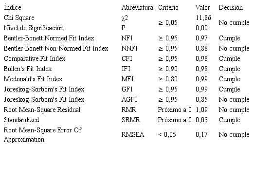 Finalmente, se comprobaron los índices de bondad y ajuste, y se encontró que la estructura factorial cumple con el X2, NNFI, CFI, IFI, MFI, RMR, SRMR y RMSEA; No obstante, no cumple los criterios para el Chi Square (χ2), Bentler-Bonett Non-Normed Fit Index (NNFI), Joreskog-Sorbom's Fit Index (AGFI), Root Mean-Square Residual (RMR) y el Root Mean-Square Error Of Approximation (RMSEA) (ver tabla 7).