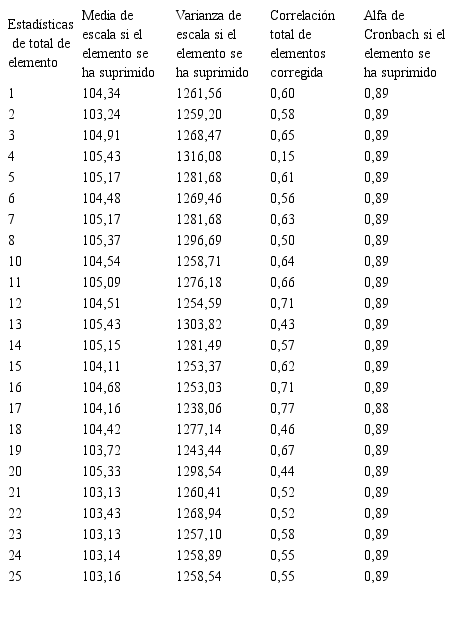 Finalmente, en lo relacionado a la consistencia interna de la escala, se encontraron correlaciones estadísticamente significativas (Rho ≥0,20; α <0,05) (ver tabla 10 y 11).