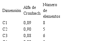 Por otra parte, en lo relacionado a la fiabilidad del instrumento, se encontró que los reactivos, dimensiones y la escala en general, cuentan con un nivel de confianza muy alto (α ≥ 0,80) (ver tabla 8 y 9).