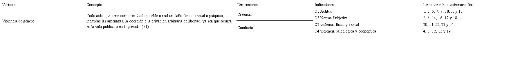 Las preguntas de la escala se redactaron basándose en las variables creencias y violencia de género, operacionalizadas coherente con referentes teóricos (ver tabla 2. Operacionalización de la variable), seguido al diseño y redacción de reactivos se procedió a la validación de aspecto y contenido por juicio de expertos, a partir del cual se obtuvo una versión preliminar de la escala.