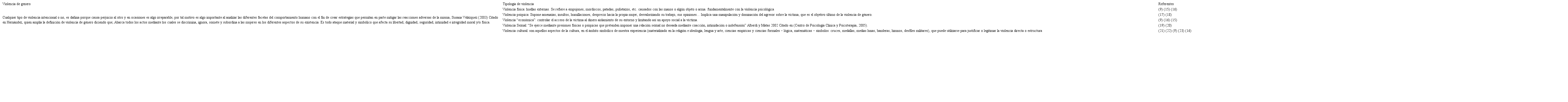 Por otro lado, en muchas ocasiones la víctima guarda silencio de los actos de agresión, ya sea por amenazas contra su integridad física o por presión social14 es decir, representación de dominio y poder de un género sobre otro. A continuación, se presentan las diferentes manifestaciones de la violencia de género a partir de la revisión de antecedentes y literatura científica: