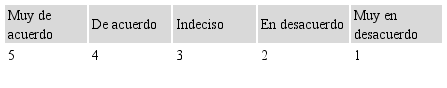 En el recuadro siguiente existen 5 categorías representadas por números que van del 1 al 5. Debe seleccionar la opción que se ajuste a su criterio personal. Para dar contestación a las preguntas formuladas en este cuestionario se marca el número que expresa la cuantía de acuerdo o desacuerdo que le merece la proposición que se le hace.