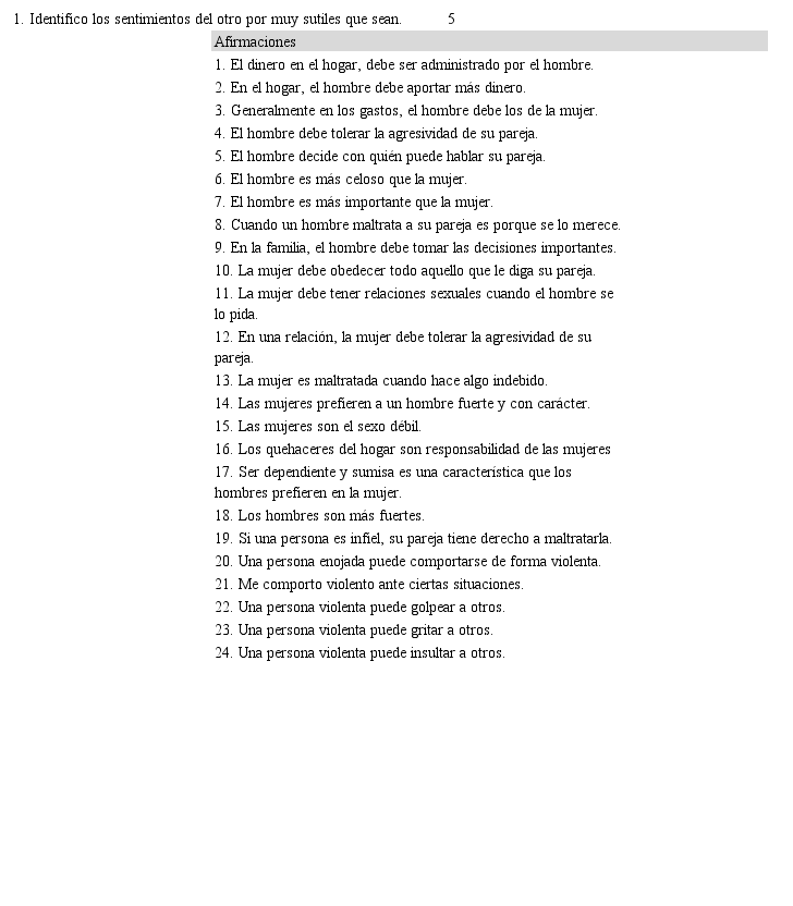 Se obtuvo una versión final de la escala breve de creencias sobre violencia de genero de 24 ítems, con cinco opciones de respuesta muy de acuerdo (MDA): Si está de acuerdo intensamente con lo que se le propone, de acuerdo (DA): Si está de acuerdo en algo de lo que se le propone, Indeciso (I): Si es neutral o está indeciso de lo que se le propone, En desacuerdo (ED): si no está de acuerdo con lo que se le propone, Muy en Desacuerdo (MED): Si esta intensamente de acuerdo con lo que se le propone, en la prueba piloto, tanto como en la prueba de campo las personas comprendieron los reactivos y escala Likert.(Anexo escala breve de creencias sobre violencia de género).