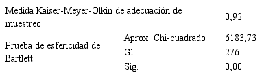Para proceder al desarrollo de la primera fase, primero se realizó la prueba de KMO y de esfericidad de Bartlett, para identificar si se podía aplicar el Análisis Factorial. En la prueba de medida de Kaiser, Meyer y Olkin, se identificó un coeficiente de 0,92 y en la prueba de esfericidad de Bartlett, un nivel de significación de 0,00, por lo cual se concluyó que es viable la reducción de dimensiones a través del AF (ver tabla 1).