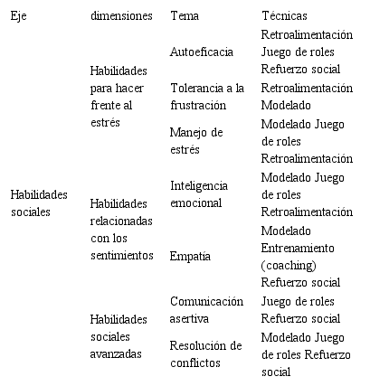 La estructura teórica, coherente con el instrumento aplicado, fue tomada de las bases de la terapia de aprendizaje estructurado de Goldstein, Sprafkin y Gershaw36, logrando así la aplicación de una intervención psicoeducativa para el entrenamiento de competencias sociales37.