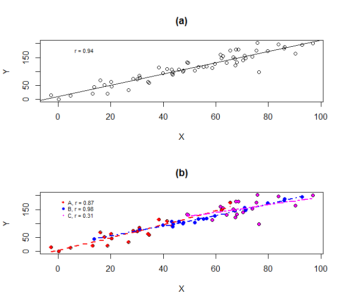 Figura 3. (a), gráfico de dispersión con línea de ajuste en un conjunto de datos no desagregado, coeficiente de correlación bruto de 0.94; (b), gráfico de dispersión con líneas de ajuste desagregadas según grupos A, B y C, coeficientes de correlación individuales.