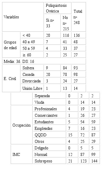 En las mujeres con diagnóstico de Poliquistosis Ovárica (n⸰ 33, de un total 248), la edad promedio fue 36 años, y el grupo más representativo fueron las < de 40 años (n⸰ 20), de estado civil casadas (n⸰ 20), de ocupación quehaceres domésticos (n⸰ 15), y con sobrepeso (n⸰ 21).