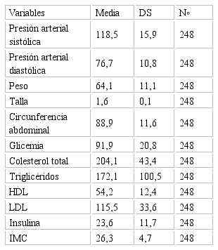 La población estudiada tuvo una media para la presión arterial de118.5/76.7; un valor de circunferencia abdominal de 88.9 cm; glicemia de 91.9 mg/dl; con un nivel de insulina de 23.6 µU/ml y un IMC 26,3.