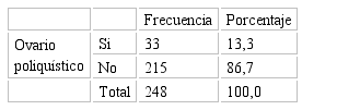 Resultados: La prevalencia del ovario poliquístico fue del 13,3% (n⸰ 33). La media de la edad, 36 años (DS 16); el grupo más representativo fueron las < de 40 años (n⸰ 136); de estado civil solteras (n⸰ 93); de ocupación QQDD (n⸰ 87); con IMC de sobrepeso (n⸰ 144). Solo un factor se consideró estadísticamente significativo y fue el aumento en la concentración de estrógenos OR 1.4, IC 95% 2,8 – 55.6, valor de p = 0,000.