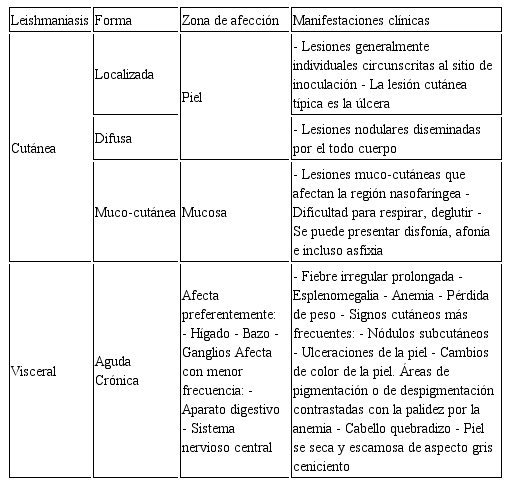 Tabla 2. Características clínicas principales de la Leishmaniasis cutánea y visceral