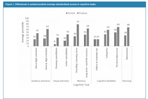 In attention process, increase in the volume of digits retention task were observed. Likewise, in the drawings and letters selection task, errors of omission and commission were decreased while execution speed in task was increased. In words memory tasks, major volume of words recall was observed, both short and long term. Finally, in the planning tasks through designs, to decrease in number of movements for the realization of each model was found (Figure 1).