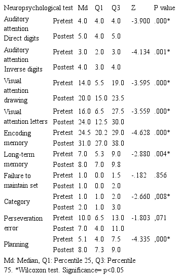 In attention process, increase in the volume of digits retention task were observed. Likewise, in the drawings and letters selection task, errors of omission and commission were decreased while execution speed in task was increased. In words memory tasks, major volume of words recall was observed, both short and long term. Finally, in the planning tasks through designs, to decrease in number of movements for the realization of each model was found (Figure 1).