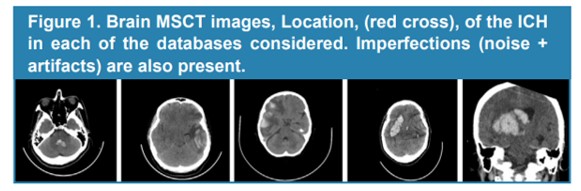 Additionally, it is important to note that digital brain neuroimages are accompanied by various imperfections such as noise3,4 and artifacts5. These imperfections become real challenges, when computational segmentation strategies are implemented oriented towards the generation of the morphology (normal or abnormal) of both the anatomical structures of the brain and of space-occupying lesions, such as, for example, hematomas6. Figure 1, generated based on multilayered computed tomography (MSCT) images, presents axial views of the 5 ICH that were considered in this work. In addition, it is observed the presence of the main problems typical of this type of image linked to noise (Poisson) and artifacts (Staircase and Partial Volume).