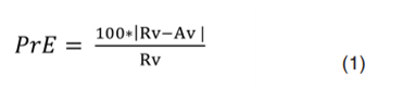 b) Consider the percentage relative error (PrE) to perform a comparative study between the ABC methods and the SAT method, in such a way that their performance can be established when they obtain the volume of the ICH (Av). During the comparison, the one obtained by the planimetric manual method (MPM), applied by a neurosurgeon, is taken as the reference volume (Rv). The percentage relative error is calculated using the mathematical model given by equation 1.