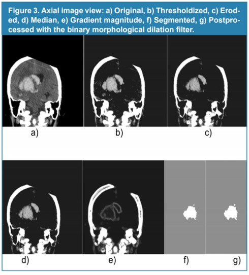 Abstract: This work evaluates the performance of computational methods aimed at volume generation of five intracerebral hematomas (ICH), present in multi-layer computed tomography images. First one, a ground truth volume or reference volume (RV) is considered. This RV is obtained, by a neurosurgeon, using the manual planimetric method (MPM), which allows the generation of manual segmentations of space-occupying injuries which, in this case, are matched with the ICH. The MPM consists in: a) Manually drawing the contour that delimits the ICH, in each of the layers or cuts in which the ICH is present b) Calculate the partial area using the number of pixels contained in each contour c) Obtain the total area of the ICH by adding the partial areas d) Calculate the volume considering the total number of layers, the total area of the ICH and the thickness of each layer. In second place, the volumetry of the 5 ICH’s is obtained considering both the original version of the ABC/2 method and two of its variants, identified in this paper as ABC/3 method and 2ABC/3 method. The ABC methods allow for calculating hematoma volume under the geometric assumption that the ICH has an ellipsoidal shape. In these methods, A is the maximum diameter of the ICH, B is the length of the ICH measured, perpendicularly, with respect to the parameter A; while C represents the product of the thickness of the cut by the number of cuts in which the ICH is present. In third place, a smart automatic technique (SAT) is implemented to generate the three-dimensional segmentation of each ICH and from it the volume of the hematoma is calculated by multiplying the voxel dimensions by the number of voxels that make up the ICH. In the context of the present work, the expression SAT method will be used to refer to the new methodology that is proposed to calculate the volume of the ICH. The SAT consists of the pre-processing, segmentation and post-processing stages. During pre-processing, a thresholding algorithm and a bank of computational filters are used to address artifact and image noise problems. In segmentation, the growth of regions is applied to pre-processed images. Finally, a morphological dilation filter is used as a technique to perform the post-processing of the segmented images. In order to make judgments about the performance of the SAT, the Dice coefficient (Dc) is used to compare the dilated segmentations of the ICH with the ICH segmentations generated, manually, by a neurosurgeon. The combination of parameters linked to the highest Dc, allows to establish the optimal parameters of each of the computational algorithms that make up the SAT. Finally, the percentage relative error is calculated as a metric to evaluate the methodologies considered. The results show that the SAT method exhibits the best performance, generating an average percentage error of less than 3%.