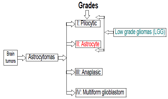 Furthermore, gliomas can be classified into high-grade gliomas (HGG) and low-grade gliomas (LGG). Thus, anaplastic astrocytomas and glioblastoma multiform tumors are included in HGG; while grade II astrocytoma (Astrocite) and oligoastrocytomas, are included in LGG6. The present study focuses on tumors reported in the literature as LGG, that represent approximately 27% of all primary brain tumors. The median age at time of diagnosis ranges between 43 and 48, depending on histologic subtype7.
