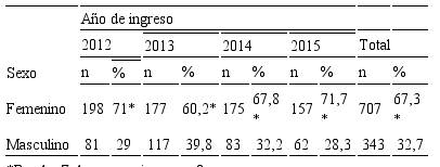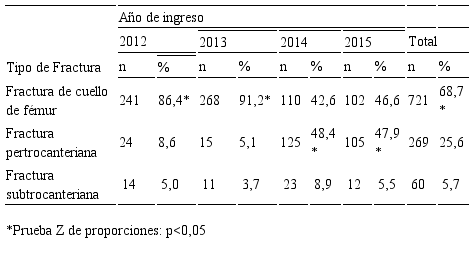 Resultados: Se incluyeron 1050 pacientes, con predominio del sexo femenino (67,3%; n=707) y una distribución anual de ingreso: (2012 – n=279; 2013 – n=294; 2014 – 258; 2015 – 219). Hubo un predominio en mujeres 67,3% (n=707), pacientes con 75-85 años (34,9%; n=366) y fractura de cuello de fémur (68,7%; n=721). No obstante, los sujetos con fractura de cadera con edad menor a 75 años, fueron más frecuente del sexo masculino (47,7%) y con fractura subtrocanteriana (43,3%).