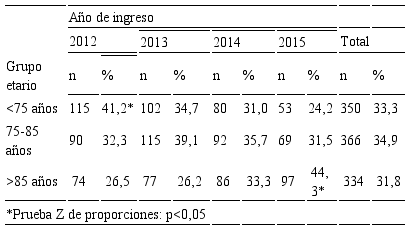 En la Tabla 1 se muestra la distribución de ingresos anuales según sexo con un predominio del sexo femenino en todos los años, en la evaluación general según grupos etarios la frecuencia más elevada de sujetos fue en el grupo de 75-85 años con 34,9% (n=366), Tabla 2. La distribución según sexo y grupo etario se observa en la Figura 2.