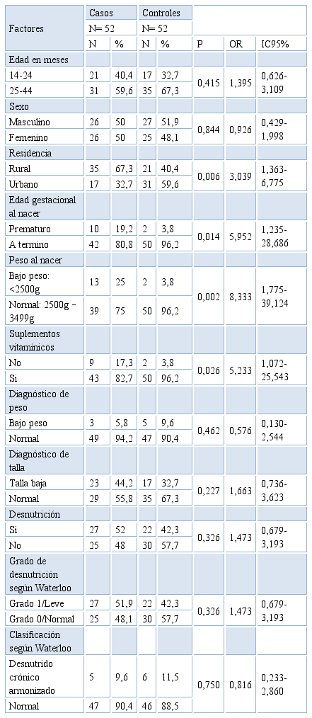 Materials and method: A Quantitative, analytical case-control study, cross sectioned with retrospective temporality. The sample size was 52 cases and 52 controls with the study population of children from the Children's Development Center "Los Pitufos". The information was obtained through the elaboration of a data collection sheet, where a review of medical records was carried out, such as the value of hemoglobin in blood, vitamin supplements, weight and height. In terms of birth, weight and gestational age, they were obtained from vaccination cards. Associations were sought through the ratio of mummies, χ2 and logistic regression.
