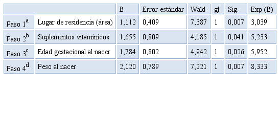 Se encontró asociación significativa a la anemia en las variables: lugar de residencia (p=0.006; OR=3,039; IC95%=1,363-6,775), suplementos vitamínicos (p=0,026; OR=5,233; IC95%=1,072-25,543), edad gestacional al nacer (p=0,014; OR=5,952; IC95%=1,235-28,686), y peso al nacer (p=0,002; OR=8,333; IC95%=1,775-39,124).