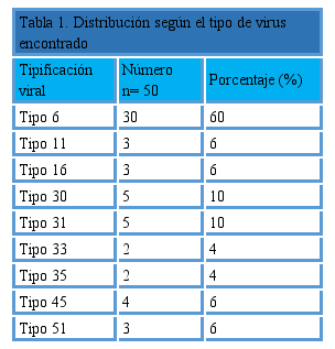 Se evaluaron 112 pacientes portadoras de patología cervical, de las cuales 22 pacientes (19,64%) presentaron citología positiva al momento del ingreso, 32 (28,57%) tenían biopsias positivas y 58 (51,78%) se incluyeron por presentar biopsia y citología patológicas. En relación con el resultado de la tipificación viral, 50 pacientes (44,6%) resultaron positivas. De estas 50 pacientes, 30 pacientes (60% presentaron tipificación positiva para un solo tipo de virus el 6, y 7 pacientes (14%) para más de un tipo viral (Z=14,596 P=0,001). Hubo 62 pacientes (55%) con resultados negativos para tipificación viral. En los 7 casos donde se observó más de un tipo viral, las combinaciones fueron 6-11, 6-16, 6-33, 6-51, 11-51 (un caso cada uno). Entre las pacientes positivas, se observó con mayor frecuencia el virus 6 con 30 pacientes (60%), [M11] seguido por el virus 30 y 31 con 5 pacientes (10%),cada uno y el tipo 45 con 4 (6%) El resto de los tipos virales se evidencian en la Tabla 1.