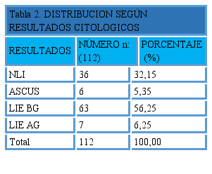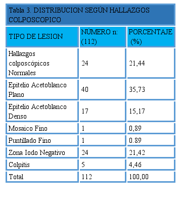 La distribución de las pacientes según el resultado de la citología se representa en la Tabla 2. Se destaca la presencia de 63 casos con hallazgos sugestivos de lesión intraepitelial cervical de bajo grado (56,25%), 7 (6,25%) con hallazgos sugestivos de lesión intraepitelial cervical de alto grado; 36 casos (32%) negativos para lesión y 6 casos (5,35%) ASCUS (Atypical Squamous Cells of indetermined significance, por sus siglas en Ingles. Células glandulares Atípicas de significado indeterminado). En relación con las lesiones colposcópicos encontradas 24 pacientes (21,4%) tuvieron colposcopias normales; hubo 5 casos de colpitis (4,4%) y 82 casos con cambios colposcópicos, los cuales se describen en la Tabla 3.