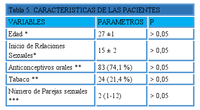 En la Tabla 5 se observan los factores de riesgo de las pacientes. La edad promedio fue de 27±1 años, el inicio de relaciones sexuales fue a los 15±1 año. En cuanto al número de compañeros sexuales, la mediana fue 2 con extremos entre 1 y 12 parejas sexuales. Con respecto a los hábitos psico-biológicos el 100% negó el consumo de drogas ilícitas pero hubo 21,4% de pacientes que reportaron hábitos tabáquicos positivos (OR=6,8 IC 1,8 - 25,4, P<0,05).