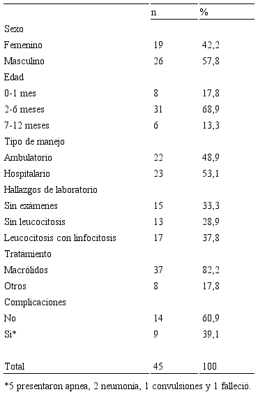 De los 45 pacientes evaluados, el 57,8% (n=26) fueron del sexo masculino, el grupo de edad más frecuente fue el de 2-6 meses (68,9%; n=31), el manejo intrahospitalario fue ligeramente superior (53,1%; n=23), la presencia de leucocitosis con linfocitosis fue lo más frecuente (37,8%; n=17), la mayoría recibió tratamiento con macrólidos (82,2%; n=37) y sólo se presentaron complicaciones en 39,1% (n=9) de los pacientes ingresados Tabla 1.