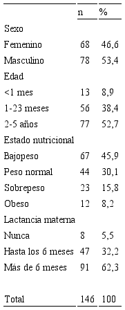 De los 146 pacientes evaluados, el 53,4% (n=78) fueron del sexo masculino, el grupo de edad más frecuente fue el de 2-5 años (52,7%; n=77), el bajo peso fue el estado nutricional más frecuente (45,9%; n=67) y la mayoría recibió lactancia materna más de 6 meses (62,3%; n=91) Tabla 1.