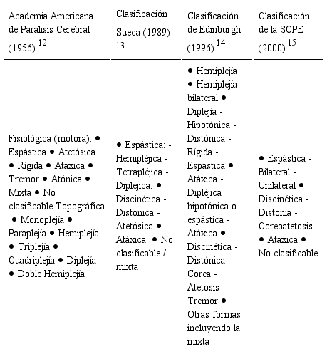 La clasificación de la PCI puede realizarse desde distintos enfoques, por ejemplo desde un punto de vista fisiopatológico la lesión cerebral puede generarse en la corteza o tracto piramidal (i) lo que genera hipertonía espástica e hiperreflexia; en el sistema extrapiramidal o núcleos basales (ii) con movimientos anormales (discinesia) como coreoatetosis; de lesión cerebelar (iii) con ataxia e hipotonía; o mixto (iv). Las formas espásticas de PCI son las más comunes lo que indica el lugar más frecuente de lesión. En el caso de las alteraciones extrapiramidales, la etiología predominante es el kernicterus, estos niños tienen inteligencia normal pero tienen déficits motores y de comunicación. Por otro lado, la hipotonía cerebelar es infrecuente; mientras que el patrón mixto muestra una combinación de estas alteraciones (11).