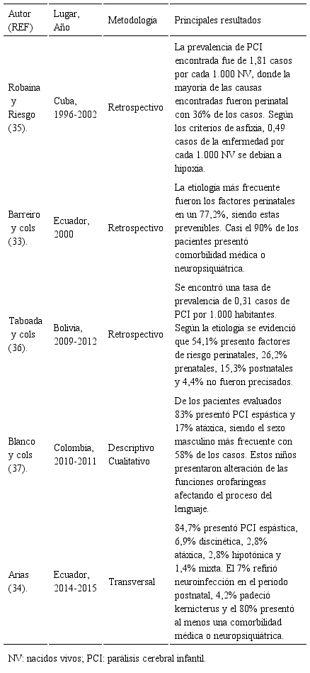 En Latinoamericana no hay un programa de vigilancia epidemiológica conjunta para la evaluación de la PCI y los estudios realizados son escasos, pero permiten estimar la realidad de esta patología en los países de la región. En Ecuador, en un estudio retrospectivo realizado en 127 niños diagnosticados con PCI, se determinó que la principal causa de la enfermedad fue la asfixia perinatal (77,2%), seguido de factores postnatales (13,4%), prenatales (6,3%) y genéticas (malformaciones) en un 3,1% (33)(33). Por otro lado, se reportó la frecuencia de las formas clínicas en la ciudad de Cuenca, en una investigación realizada en un Hospital encontrando que la más común fue la espástica con un 84,7%, seguido de la discinética (6,9%) y atáxica (2,8%), a su vez el 80,6% de los niños estudiados presentó epilepsia, 75% tuvieron déficit cognitivo y 62,5% desnutrición (34). En la Tabla 2 se presentan los principales hallazgos en estudios realizados en Latinoamérica (33–37).