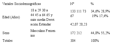 La edad fluctúa entre los 18- 94 años de edad donde predomino un 34% de 18-29 años, en segundo lugar, el 28,9% las edades de 30-44, luego el 19% comprende entre los 45 a 64 años y por ultimo tenemos el 17,4% que esta los que tiene 65 y más. En cuenta al sexo se evidenció que predomina ligeramente el sexo femenino con 55,2% y el masculino con 44,8%. (Tabla1)