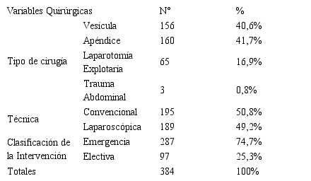 Se realizaron más cirugías de apéndice con un porcentaje del 41,7%, vesícula con 40,6%, las menos comunes fueron la laparotomía exploratoria con 16,9% y por último es de trauma abdominal con 0,8%. Según la técnica se nota que están casi equitativas ya se realizó la cirugía convencional en un 50,8% y la laparoscópica en un 49,2%. Según la clasificación de la intervención se hizo de emergencia y electiva, la primera comprende un 74,7% y la segunda en un 25,3%. (Tabla2)