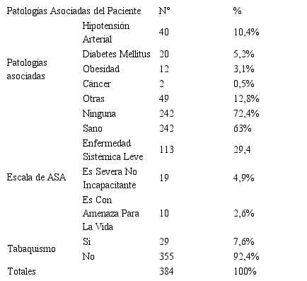 La patología que predominó fue la hipertensión arterial con un 10,4%, segundo lugar la diabetes mellitus con un 5,2%. En tercer lugar, encontramos a la obesidad con 3,1%, en cuarto lugar, tenemos pacientes al cáncer con 0,5%. Se evidencio más pacientes sin ninguna patología, estos representan el 72,4% y otras patologías con el 12,8%. También se evidencio la presencia de tabaquismo con un 7,6% y los no consumidores de tabaco representan un 92%. Según la escala asa reporto paciente sanos 63,0% con enfermedad sistemática grave 29.4%, con enfermedad sistémica severa no incapacitante el 4.9% enfermedad sistémica severa con amenaza para la vida el 2.6%. (Tabla3)