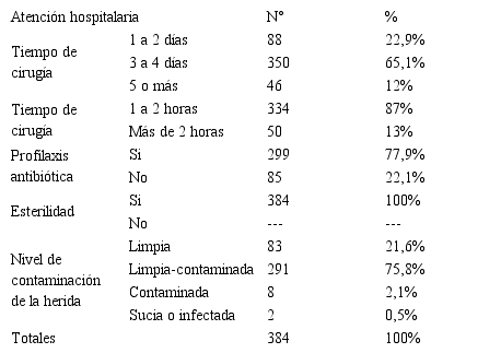 La mayoría de los usuarios tuvieron una intervención quirúrgica entre 1 a 2 horas, con un estadio hospitalario de 3 a 4 días, se realizó la cirugía en condiciones de esterilidad total y se obtuvo el 21,6% tuvo una herida limpia estos factores interviene para evitar una infección en el sitio quirúrgico. Al hacer un análisis con otras investigaciones se observó en el de Alvarado y Requena(8) los siguientes datos: los pacientes tuvieron una estancia más prolongada a el de nuestro estudio; los procedimientos fueron menores de 2 horas y representaron el 82% mayor porcentaje que nuestra investigación: también se evidencio un aumento de estadísticas en la profilaxis pre operatoria fue del 100% y las heridas limpias fueron de 62% superior a nuestro estudio.(13)(14)