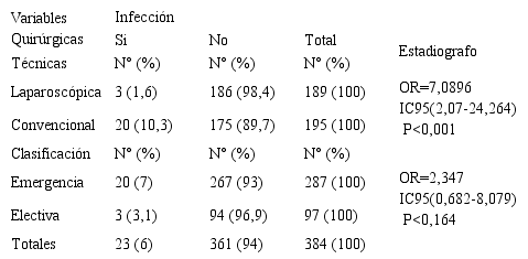 Materials and methods: An analytical cross-sectional study was conducted in 384 patients undergoing abdominal surgery in a conventional and laparoscopic manner in the Hospitals: Vicente Corral Moscoso of the city of Cuenca and Homero Castanier Crespo of the city of Azogues. The study was carried out by the Backgroun review of medical records, swabs were also used for the sampling of patients with infected surgical wounds whose values were recorded in a data collection sheet. Statistical analysis used odds ratio and chi-contrasts. Pearson's square to observe association between the variables studied, a value of p <0.05 was considered statistical significance