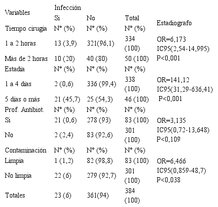 Las cirugías que tuvieron una intervención más de dos horas mostro tener seis veces más probabilidad de una infección en el sitio quirúrgico. En la estadía hospitalaria los usuarios que estuvieron más de cinco días más de la mitad de ellos tuvieron una infección en el sitio quirúrgico.