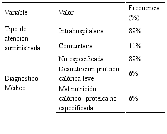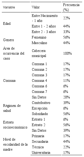 Las variables del estudio estuvieron divididas en 4 etapas. Primero, las de tipo socio-demográficas (datos de la madre, tipo de identificación, nivel educativo de la madre, estrato socioeconómico, número de niños menores de 5 años). Segundo, las variables de identificación de factores (peso al nacer, talla al nacer, edad gestacional al nacer, tiempo que recibió leche materna, edad de inicio de alimentación complementaria, inscripción a crecimiento y desarrollo (primera infancia), esquema de vacunación completo, referido por carné de vacuas, peso actual, talla actual, circunferencia media del brazo). Tercero, las variables de signos clínicos (Edema, desnutrición, emaciación o delgadez visible, piel reseca o áspera, hipo o hiperpigmentación de la piel, lesiones del cabello, anemia (detectada por palidez palmar o de mucosas). Y cuarta, variables de ruta de atención (activación de ruta de atención, tipo de atención suministrada, días de hospitalización, recibe tratamiento terapéutico, seguimiento domiciliario, visita inefectiva)