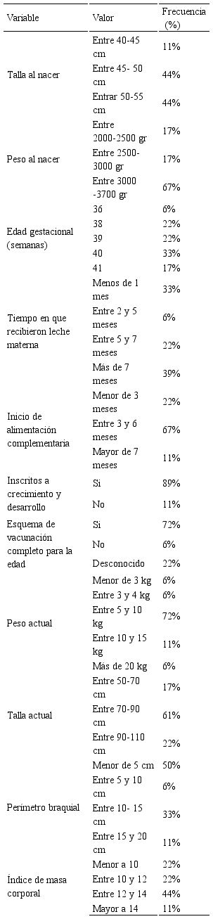 Conclusiones: Se concluyó que peso y talla al nacer podrían indicar que los menores, a medida que pasa el tiempo, sufren deterioro de su estado nutricional y de salud por múltiples factores como el consumo de lactancia materna exclusiva por corto tiempo y la inadecuada iniciación de alimentación complementaria.