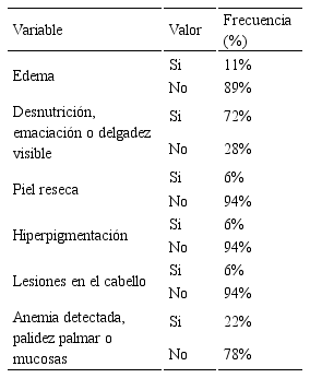A nivel nacional los niños presentan 9.8% edema, similar a nivel municipal donde el reporte fue del 11%. En Palmira el 72% de los niños presentaron signos de delgadez, mientras que a nivel nacional fue un porcentaje diferente porque se presentó 63.6%. Se observó que a nivel municipal los niños presentan menos lesiones de piel encontrándose en un 6% mientras que a nivel nacional fue mayor con un 21%.