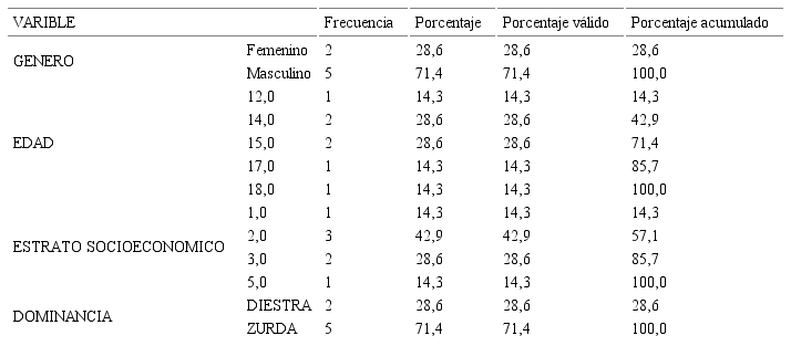 La tabla muestra las características sociodemográficas de la población a estudio (n=7) (tabla1), se puede observar que la mayor frecuencia de la población es de género masculino con un total de 5 deportistas. De igual manera se evidencia que el mayor número se encuentran en el rango de edad entre 14 y 15 años. En cuanto al estrato socioeconómico se observó que el mayor número de los deportistas pertenecen al estrato 2-3 y con una mayor frecuencia se encuentran la dominancia izquierda (71%).