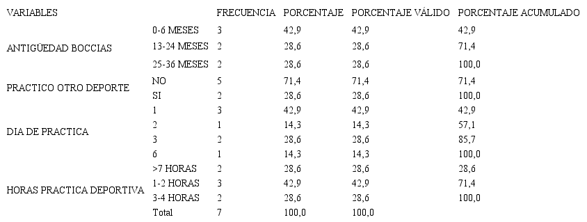 La tabla 2 muestra como se ha desarrollado la práctica deportiva de boccias, observando una antigüedad en el entrenamiento mayor a 6 meses en su mayoría, con una práctica en días promedio a la semana de 3 y horas a la semana entre 1 a 2.