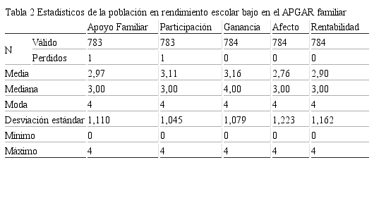 Las relaciones familiares de los estudiantes con rendimiento escolar bajo que requieren mayor intervención son el afecto, rentabilidad, apoyo familiar, participación y ganancia. Los resultados son similares a Hill y Tyson, dónde una baja implicación familiar hacia la socialización académica deriva en un bajo rendimiento académico11.