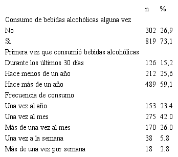 Respecto al consumo por primera vez, se encontró que el 73,1% de los estudiantes que participaron en este estudio consumieron alcohol alguna vez en su vida, y que el 59,1% de éstos, su primera vez de consumo ocurrió en el último año de su edad actual. En otras investigaciones se encontró también que más de la mitad de los jóvenes consumieron alguna vez en su vida con un 69.2%13, 67.9%30 y 95%31.