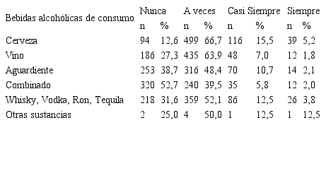 En la tabla 2, se muestra que la bebida que más consumen (casi siempre o siempre) los adolescentes participantes son: cerveza (20.7%), whisky, vodka, ron y tequila (16.3%) y aguardiente (12.9%). Las bebidas de menos consumo son las combinadas (alcohol más refrescos o energizantes) con un 7.7% y consumo de vino (8.8%).