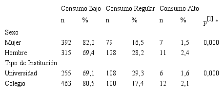 Ahora la tabla 3, muestra la frecuencia de consumo: bajo (no consume o consume una vez al año o al mes), regular (consumo más de una vez al mes) y alto (consumo más de una vez a la semana), en función de algunas variables como el sexo y el tipo de institución. Se evidencia que existe una relación estadísticamente significativa entre la frecuencia de consumo y el sexo (p=0.000), el tipo de institución (p=0.000). Características como ser hombre, estudiar en la universidad son factores de riesgo para el consumo frecuente de alcohol.