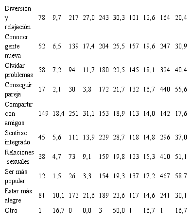 Con respecto a las creencias de los adolescentes y jóvenes sobre el alcohol, se encontró que el 49.5% considera que está de acuerdo con que éste le permite compartir con sus amigos, un 36.7% y le permite divertirse y relajarse, y un 31.7% considera que le permite estar más alegre. Resultados en otros estudios similares, se encontraron en una muestra de 787 jóvenes, el 39% de los participantes refirieron consumir alcohol con el propósito de relajarse, el 5% mencionaron que el consumo de alcohol permite iniciar una relación de amistad, el 10% expresó lograr el olvido de sus problemas académicos, 5% problemas familiares y 5% problemas sentimentales32.